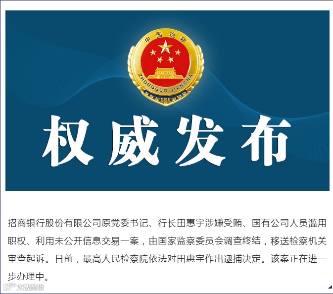 10月26日,据最高检微信公众号消息,田惠宇涉嫌受贿、国有公司人员滥用职权、利用未公开信息交易一案,由国家监察委员会调查终结, 移送检察机关审查起诉。日前,最高检依法对田惠宇作出逮捕决定。该案正在进一步办理中。