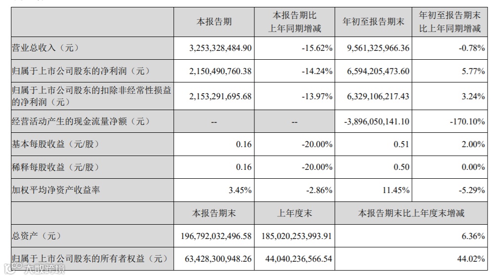东方财富三季报显示,今年前三季度,公司实现营业收入95.61亿元,同比下降0.78%;实现归属于上市公司股东的净利润65.94亿元,同比增长5.77%。ROE(加权平均净资产收益率)出现了下滑,为11.45%,同比下降5.29%。