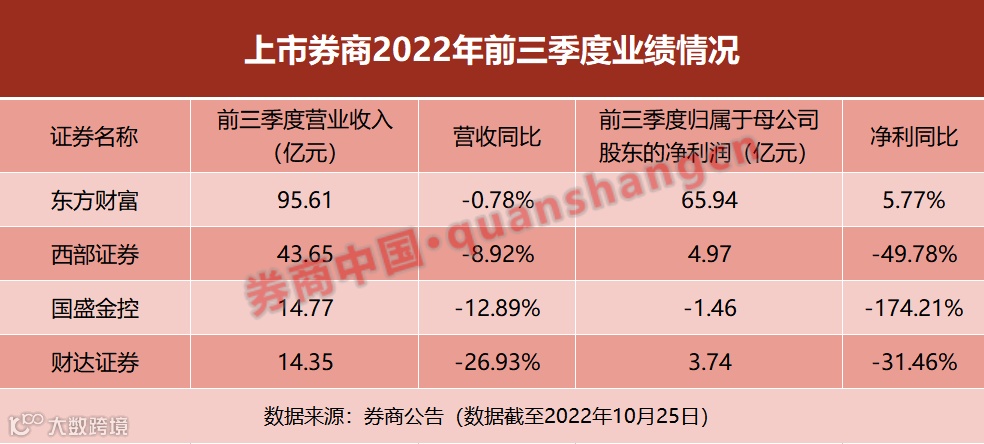 10月25日晚间,包括东方财富、西部证券、国盛金控、财达证券等4家上市券商率先披露三季报,东方财富是其中唯一净利润实现同比正增长的券商。