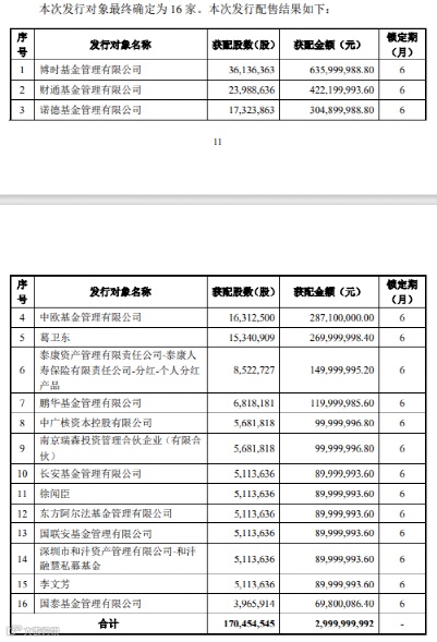 11月4日晚,湘电股份公布了定向增发发行情况。此次定增的发行价为17.6元,最终确定的发行对象为16家。其中,个人投资者葛卫东获配股数为1534万股,获配金额为2.7亿元,锁定期6个月。此次定增之后,葛卫东进入湘电股份的前十大股东。