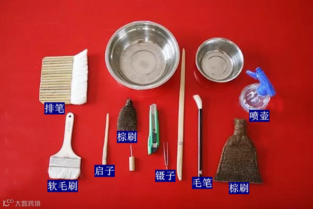 排笔、棕刷、软毛刷、毛笔、针锥、喷壶、浆水盆、启子、刀子、剪子、镊子、裁板、尺板、槌板、木槌等。