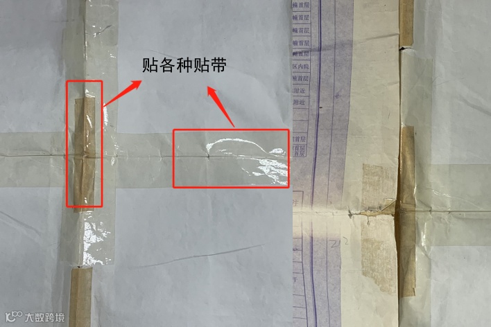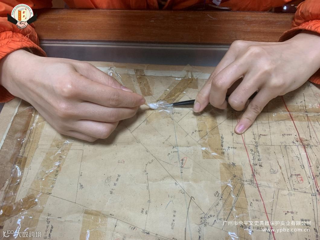 以上方法虽然简便,但透明胶、固体胶等是不可逆的加固材料,对档案有不同程度的损害。透明胶易发黄、变脆,固体胶是化学胶,容易变硬,逐渐失去粘性,难以清除,两者均会加速纸张老化,造成档案的二次损害,加大档案修复的难度。下图为档案管理员正在抢修被透明胶二次损害的图纸: