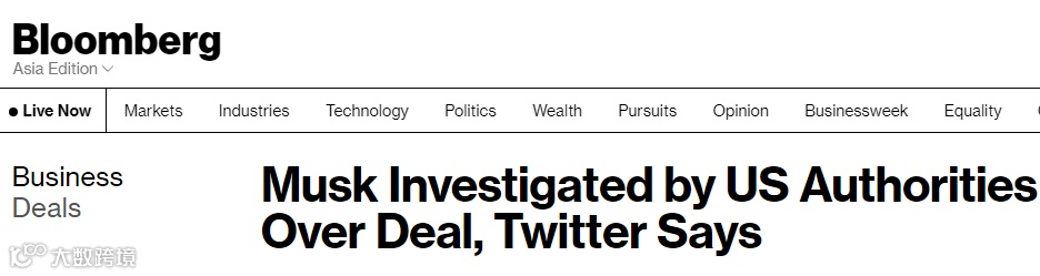 美媒:马斯克正在接受美政府调查,与其收购推特交易相关。