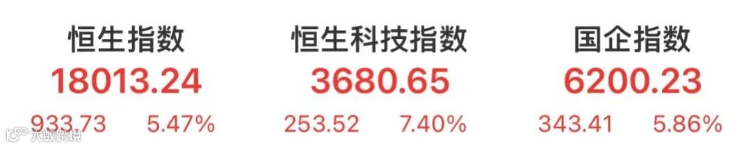 10月5日,港股大涨,恒指和恒生科技指数双双走高。截至午间收盘,恒指大涨5.47%,涨超930点,收复18000点关口;恒生科技指数大涨7.4%,板块方面,充电桩概念股、锂电池概念股领涨。成份股哔哩哔哩涨近12%,京东涨逾10%,金山软件涨逾9%,比亚迪电子、舜宇光学科技、网易等涨逾8%,阿里巴巴、美团、百度等涨逾7%。