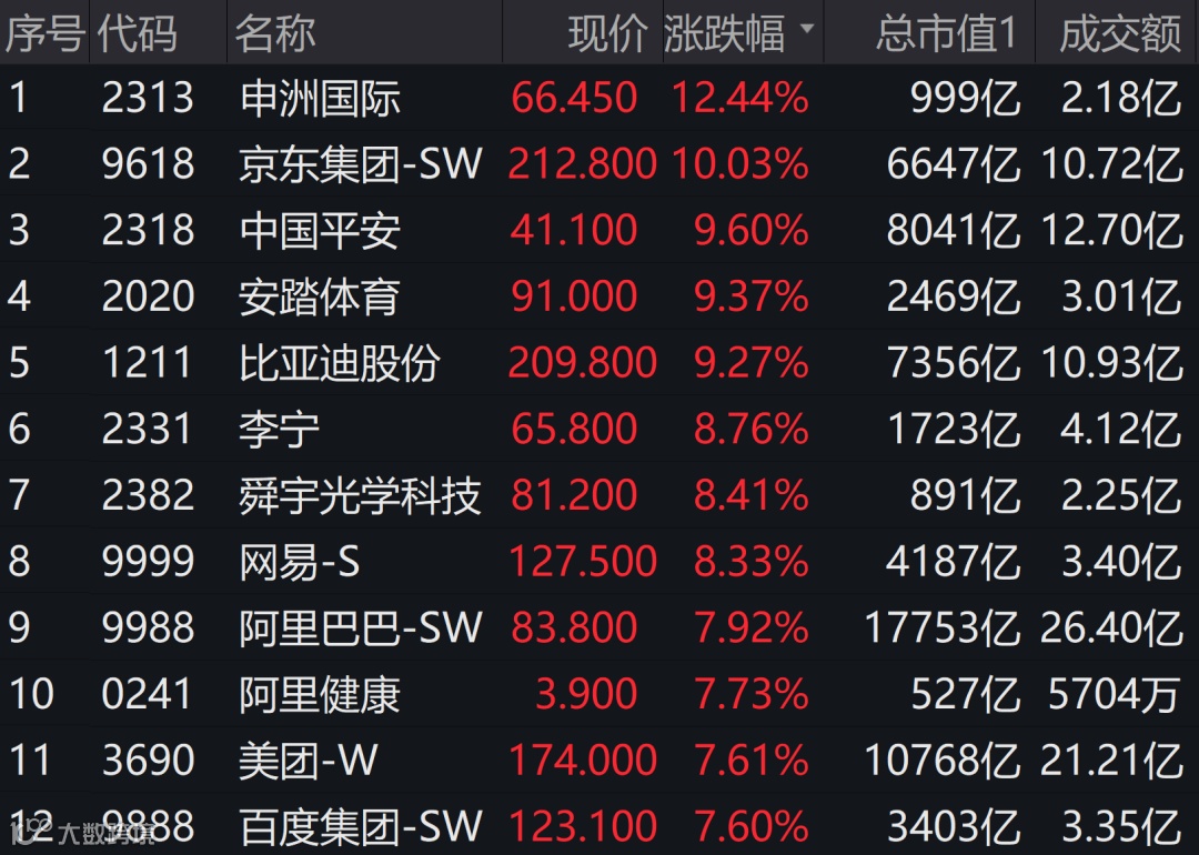 此外,中国平安H股涨幅一度逼近10%,自65个月低位大幅反弹,为3月17日以来最佳盘中表现。比亚迪股份涨幅一度超10%,为5月11日以来首次,消息上,公司9月新能源车销量首次突破20万,同比增长183.07%,远超市场预期。