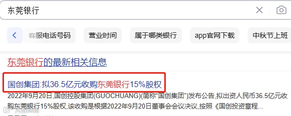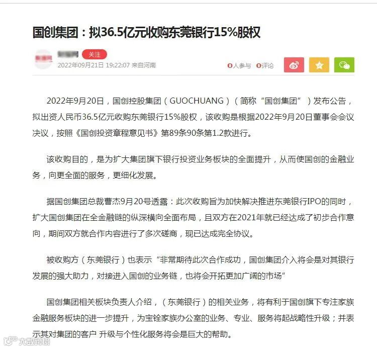 当晚流传的这则消息显示,“国创控股集团(简称‘国创集团’)发布公告,拟出资36.5亿元收购东莞银行15%股权,该收购是根据9月20日董事会会议决议,按照《国创投资章程意见书》第89条90条第1.2款进行”。