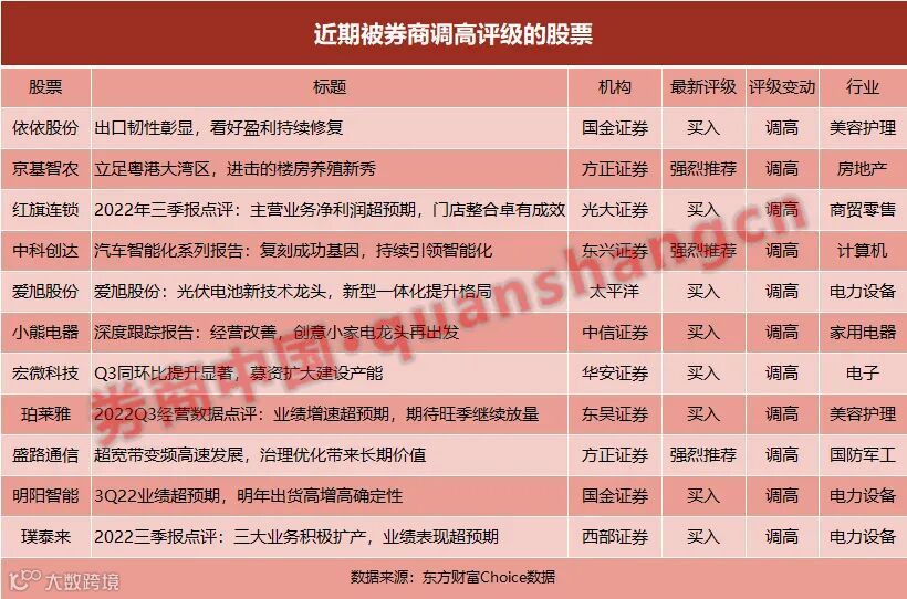 具体来看,电力设备板块共有三只股票被卖方调高评级,分别是爱旭股份、明阳智能、璞泰来;美容护理板块的依依股份、珀莱雅被调高评级;此外,京基智农、红旗连锁、中科创达、小熊电器、盛路通信也被一些券商上调评级。