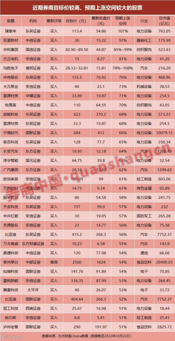 券商中国记者梳理发现,在东方财富Choice收录的券商研报中,有不少股票近期被券商分析师给出了较高的目标价,按照10月21日收盘价计算,其中有33只预期上涨空间超过50%。