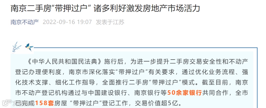 9月16日,江苏省南京市全面推行二手房“带押过户”模式。南京市不动产登记机构通过与中国建设银行、南京银行等50余家银行共同合作,全市已完成158套房屋“带押过户”登记工作,交易价值超5亿。