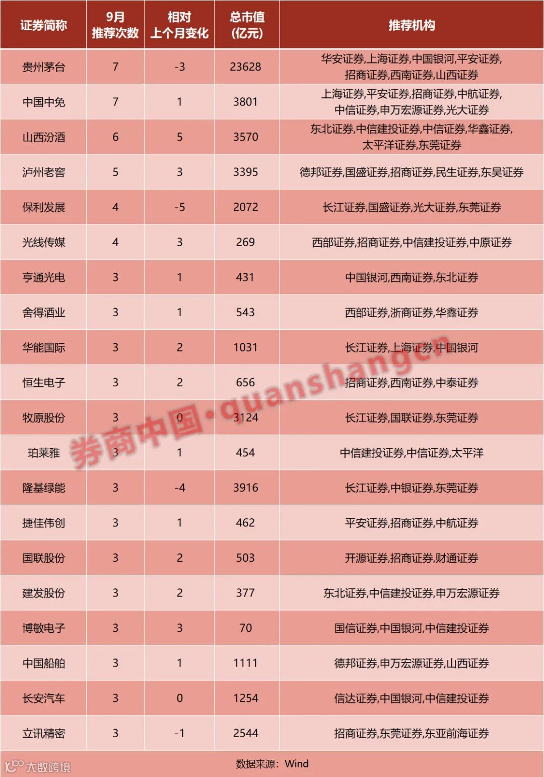 从9月券商热门金股来看,Wind数据显示,贵州茅台、中国中免仍是券商眼中的“香饽饽”,均被7家券商推荐;山西汾酒、泸州老窖9月关注度相比前一个月大幅提高,分别被6家、5家券商推荐;保利发展、光线传媒,也均被4家及以上的券商共同推荐。