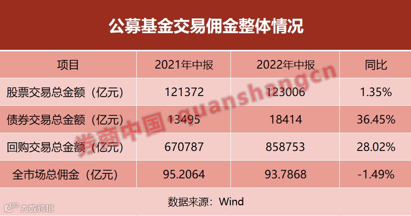 Wind数据显示,2022年上半年,公募基金共向券商支付交易佣金93.79亿元,相比2021年上半年的95.21亿元下降1.49%。