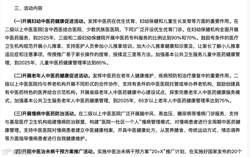 《方案》明确,中医药健康促进专项活动主要目标为中医治未病理念融入健康促进全过程、重大疾病防治全过程、疾病诊疗全过程。专项活动主要内容包括妇幼中医药健康促进活动、老年人中医药健康促进活动、慢病中医药防治活动等多个方面。