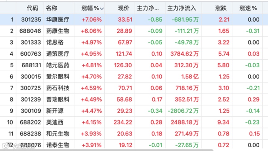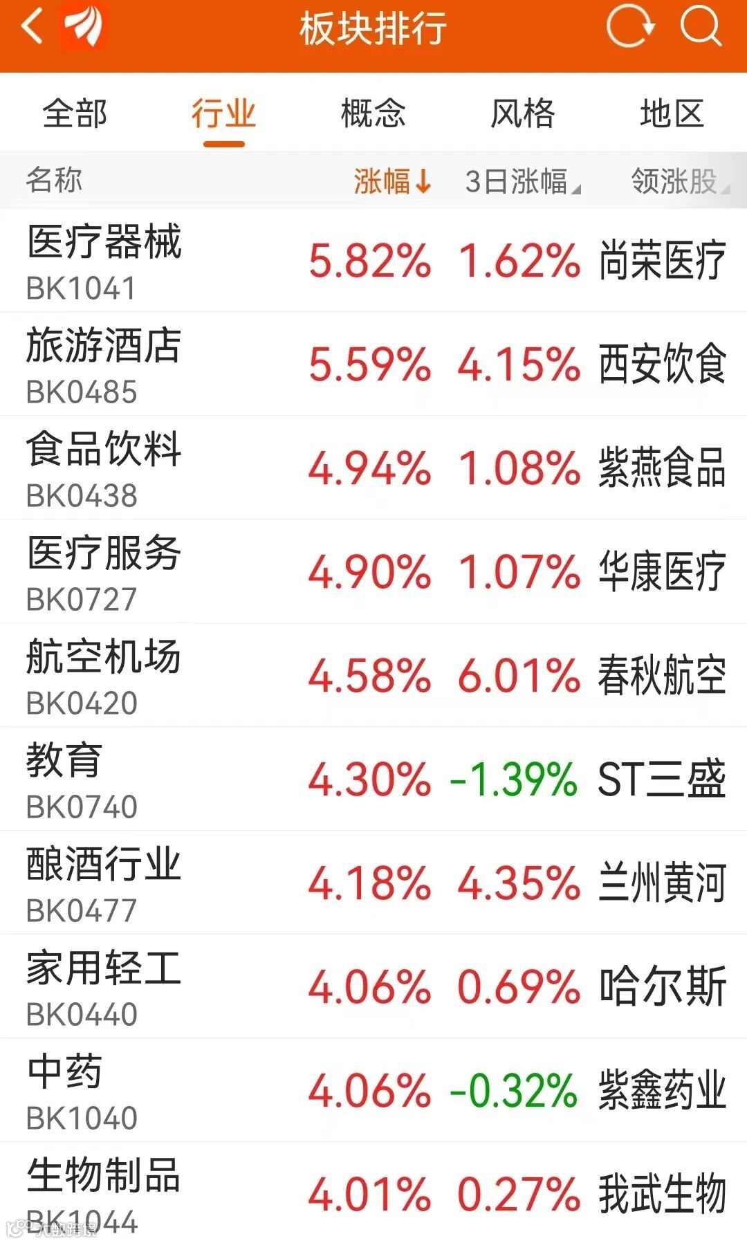 具体板块上,医疗器械、旅游酒店、食品饮料、医疗服务涨幅居前。