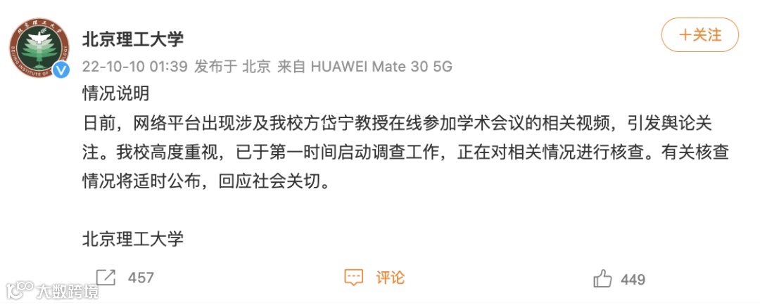 @北京理工大学 10月10日凌晨1:39,在其官方微博发布该校方岱宁教授在线参加学术会议的相关视频情况说明:日前,网络平台出现涉及我校方岱宁教授在线参加学术会议的相关视频,引发舆论关注。我校高度重视,已于第一时间启动调查工作,正在对相关情况进行核查。有关核查情况将适时公布,回应社会关切。