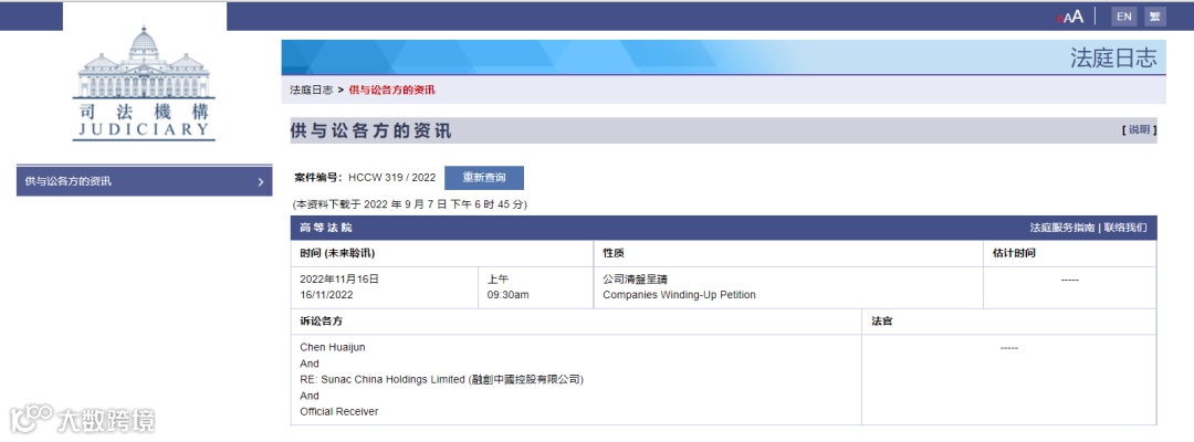 9月7日,香港司法机构网站公告显示,一位名为Chen Huaijun的人,已经在香港高等法院向融创中国提出清盘呈请。案件编号为HCCW 319/2022,聆讯时间定于2022年11月16日上午9:30。