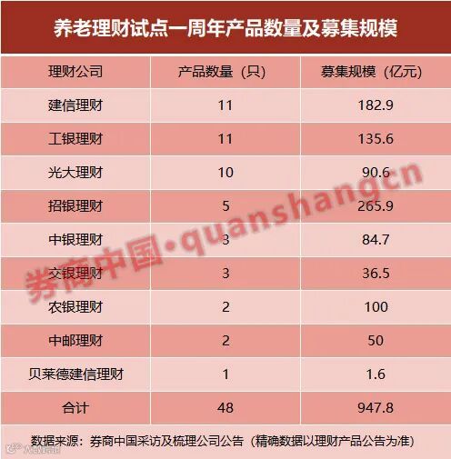 自《关于开展养老理财产品试点的通知》(下称《通知》)于2021年9月15日落地起,我国养老理财试点至今已满一周年。券商中国记者汇总多份产品成立公告,同时综合从多家理财公司处获悉的信息获知,截至目前48只养老理财产品募集规模已接近950亿元。