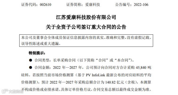 爱康科技表示,合同条款对供货量、定价原则、违约责任等作出了明确约定,买卖双方因硅料价格及购销需求波动导致的履约风险较小,本次合同的签订有利于硅料的稳定采购。