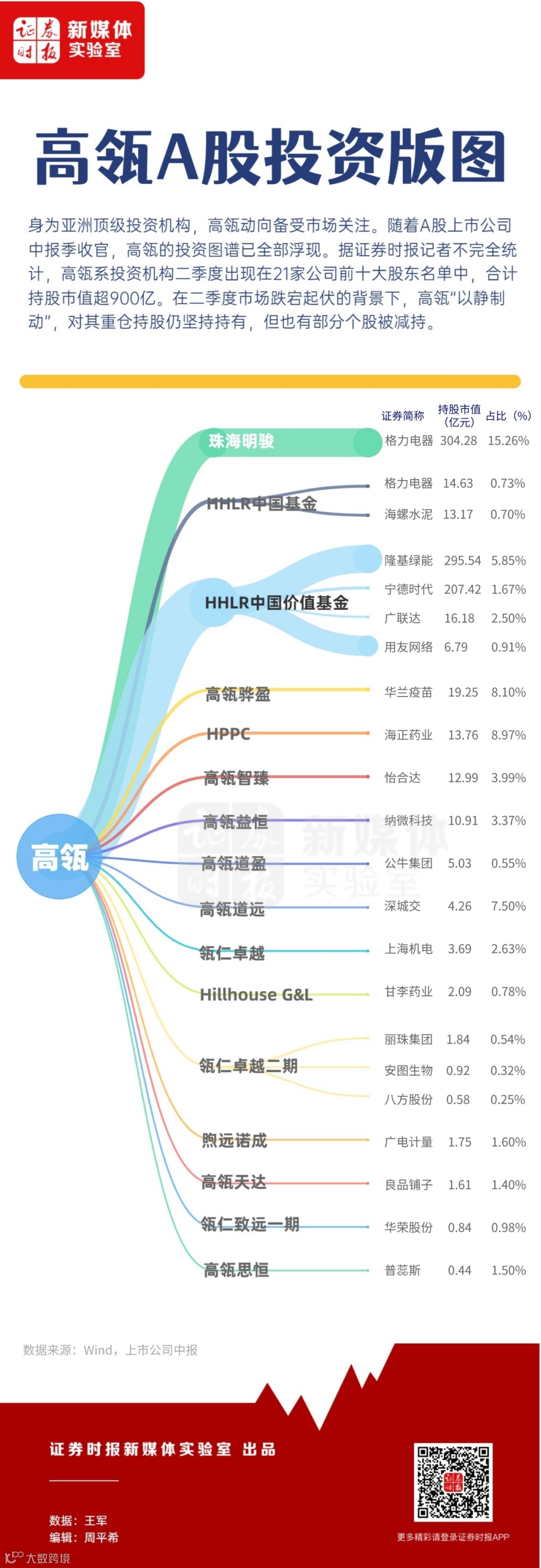 随着A股上市公司半年报收官,高瓴的A股投资图谱已全部浮现。据证券时报记者不完全统计,高瓴系投资机构二季度出现在21家公司前十大股东名单中,合计持仓市值超900亿元。在二季度市场跌宕起伏的背景下,高瓴“以静制动”,对其重仓持股坚定持有,但也有部分个股被减持。