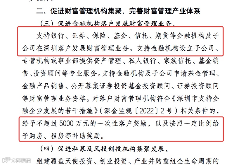 对于财富管理机构直接相关的利好政策,深圳金融局表示,支持银行、证券、保险、基金、信托、期货等金融机构及子公司在深圳落户发展财富管理业务。对落户财富管理机构符合相关条件的,给予不超过5000万元的一次性落户奖励,以及按照一定比例给予购房、租房等补助奖励。