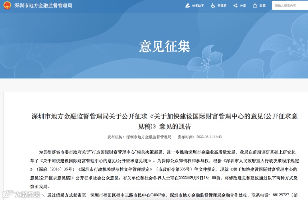 8月11日,深圳市地方金融监督管理局发布关于公开征求《关于加快建设国际财富管理中心的意见(公开征求意见稿)》意见的通告,发展目标是打造要素集聚、业态齐备、开放融合的现代化财富管理生态圈,财富管理行业规模、创新能力、开放水平、影响力竞争力达到国际领先水平。