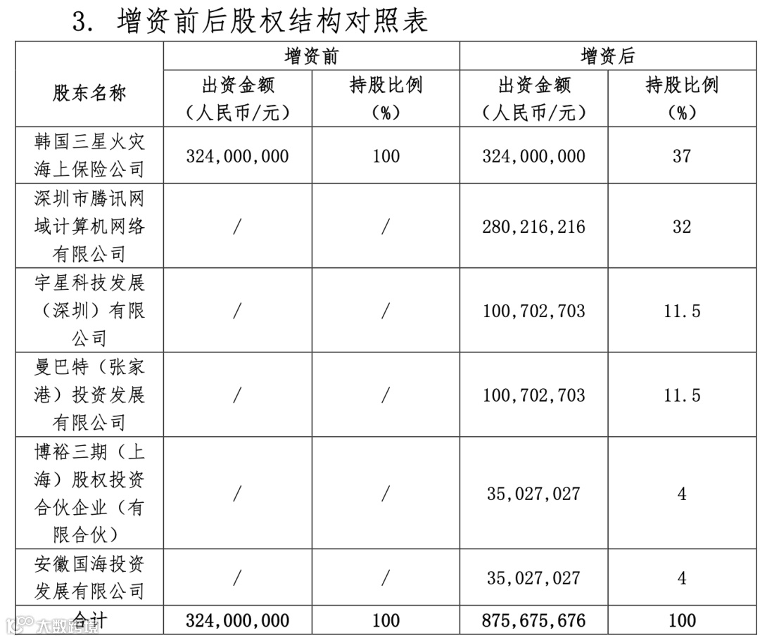 增资完成后,三星财险注册资本由3.24亿元增至8.76亿元。其中腾讯持股32%,位列第二大股东。