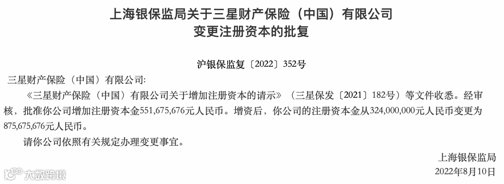根据批复,三星财险获批增加注册资本金约5.517亿元。增资后,三星财险的注册资本金从3.24亿元变更为约8.757亿元。