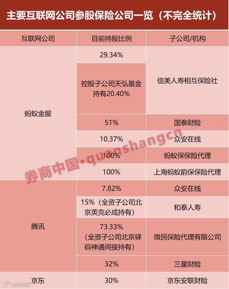 目前,互联网公司主要通过自设保险中介机构和参股直保公司完成保险行业布局。除了腾讯,蚂蚁金服也投资了多个保险实体,京东则在2018年入股京东安联财险,落下一子。