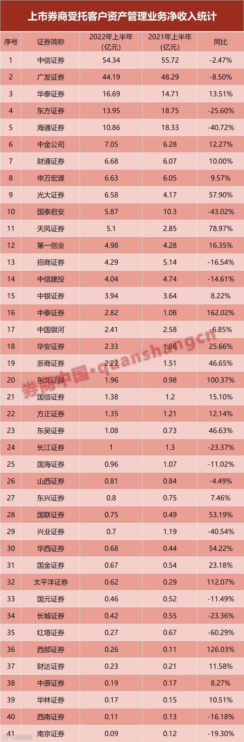 以41家上市券商为样本,对比中报合并口径下的资管业务手续费净收入(简称“资管业务净收入”,下同),可以大致窥见券商资管业务的整体面貌。Wind数据显示,上半年共有24家上市券商资管业务净收入同比增加,占比约六成,表明近半上市券商资管业务压力颇大。