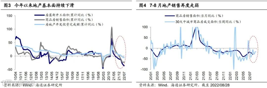 7/5日以来的调整主因是市场担心基本面,其中地产是关键。我们在《反弹到反转需要啥条件?-20220504》、《对比历史,这次可能是浅V底-20220605》等多篇报告中一直强调,结合投资时钟和牛熊周期来看,市场 4 月27日低点是 3-4 年一次的大底,5大基本面领先指标中3个回升,另外2个逐步企稳,显示市场中长期反转向上趋势确立。然而历史上市场在底部起来的第一波上涨后往往会获利回吐,核心原因是基本面还不够扎实。就本次而言,地产是本轮经济复苏波折的重要因素之一。从中长期视角来看,目前地产行业的基本面下行趋势明显,今年7月地产投资累计同比已进一步下滑至-6.4%,新开工面积累计同比下滑至-36.1%,施工面积累计同比下滑至-3.7%,竣工面积累计同比下滑至-23.3%,土地购置面积累计同比下滑至-48.1%。而根据高频数据,地产销售数据在今年6月的时候已经有所回升,但7月中旬以来停贷事件导致居民购房意愿转弱,地产销售数据再次明显下滑,30大中城市商品房成交面积当周同比从06/26的-0.1%下滑至08/28的-17.3%,因此市场对于地产风险蔓延的担忧再度升温。我们在《市场在担心什么?-20220731》中分析过,目前房地产链仍是我国经济的支柱产业,地产及相关产业在我国经济中占比接近1/3,同时房产在我国居民资产中占比近六成,是居民手中占比最大的资产。因此,地产及相关产业在我国经济中的重要性仍然非常突出,若地产持续走弱,则经济基本面难言企稳。