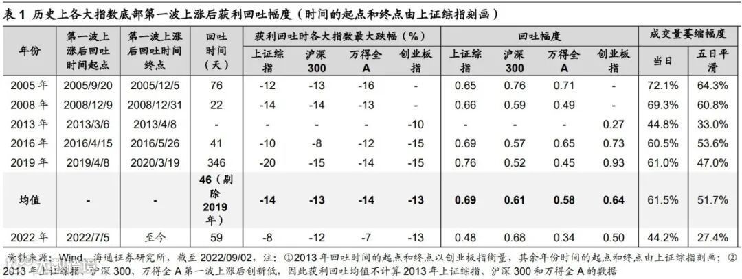 对比历史,从指数回吐和成交量萎缩幅度看,本轮调整已至后期。对于本次调整的性质,我们在《休整等待基本面-20220710》、《调整的性质:倒春寒-20220717》等多篇报告中分析过,7-8月是倒春寒式调整,即第一波上涨之后进二退一。那么如何判断本次调整的进展?借鉴历史,历次熊市见底后第一波上涨行情走完,市场往往会获利回吐,在此过程中上证指数平均下跌46天,上证指数、沪深300、万得全A、创业板指平均回撤13%左右、回吐前期上涨行情0.5-0.7左右的涨幅。目前,7/5以来的调整已持续59天,其中上证综指最大跌幅8%(回吐前期涨幅的0.48)、沪深300跌12%(回吐前期涨幅的0.68)、万得全A跌7%(回吐前期涨幅的0.34)、创业板指跌13%(回吐前期涨幅的0.50)。此外,历史上获利回吐期间全A成交量平均萎缩幅度为62%(5日平滑为52%),详见表1。而截至22/09/02时全A成交量相较前期高点缩小了44%,5日平滑口径下缩小了27%。因此,综合指数回吐和成交量萎缩幅度来看,本轮倒春寒的调整已至后期。