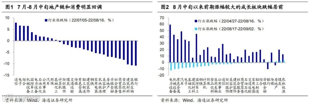 8月市场延续7/5以来的调整。8月以来市场走势整体偏震荡,A股各大宽基指数在8月17日达到阶段性高点后明显回调,至今(截至2022/09/02,下同)上证综指最大跌幅3.7%、沪深300跌5.2%、万得全A跌5.9%、创业板指跌10.2%、中证1000跌9.2%。实际上,从指数层面来看,市场从4/27底部开始的第一波上涨已经在7/5阶段性见顶,而近期指数下跌其实属于7/5市场高点以来调整的延续。不过7月初和8月中旬以来的市场调整在结构上有所差异:由于7月初开始的市场回调始于对地产和疫情的担忧,因此地产链和消费跌幅居前,7/5-8/16期间银行跌10.8%、医药跌10.6%、建材跌10.2%、食品饮料跌8.2%;而8月中旬以来跌幅居前的行业为前期上涨幅度最大的成长板块,8/17至今电力设备跌12.4%、机械设备跌10.2%、汽车跌8.7%、电子跌8.2%。