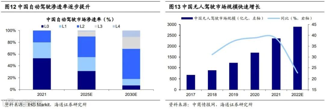 除了风光储和电动车,成长中还可关注数字经济相关领域。当前发展数字经济已是国家战略,政策支持力度不断加大。其中数字基建是数字经济发展的基础,云计算、数据中心等基建投资正不断加码。中国信通院预计21-25年期间我国云计算市场规模复合增速将高达32.7%。除此之外,互联网平台正在步入健康发展的轨道。7月28日中央政治局会议对于平台经济要求“实施常态化监管,集中推出一批‘绿灯’投资案例”,我们认为数字经济有望成为互联网的“绿灯”之一。中国互联网企业在云服务市场均占有较高份额,并以此推动工业互联网的发展,中商情报网预计2022年我国工业互联网产业规模将达到1.1万亿。此外,中国互联网企业自动驾驶技术领先,并带动产业链上下游协同发展。未来中国自动驾驶的渗透率有望快速提升,中商情报网预计2022年中国无人驾驶产业规模将达到2894亿元。