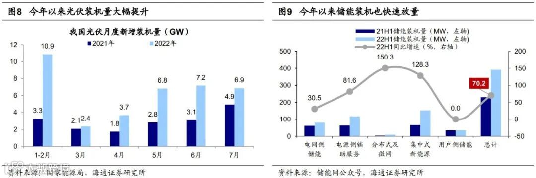 行业层面,继续看好高景气成长,如新能源、数字经济。具体行业方面,新能源相关产业的高景气将支撑行业表现。今年4月下旬我们结合基本面和市场面维度多次强调看好以新能源为代表的高景气成长。今年1-7月光伏新增装机维持高增速,较去年同期增长110%,国家能源局预计22年光伏发电新增并网同比增长96%;新型储能也迎来快速发展,今年上半年电化学储能总装机量较去年同期增长70%,GGII预测2025年中国储能锂电池出货量接近390GWh,5年复合增长率超60%。新能源车方面,根据乘联会预测,8月新能源车零售销量将达到52.0万辆,同比增长108.3%,环比增长7.0%,预计今年全年新能源车销量将达650万辆,有望支撑行业进一步表现。
