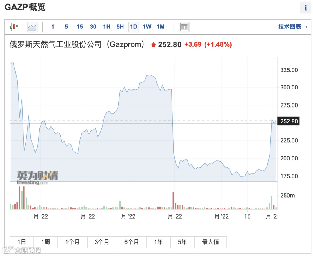 近日,一则利好消息,刺激俄罗斯天然气公司(俄气公司)股价大幅暴涨,截至发稿,俄气公司股价升至252.8卢布,相比8月最低点,累计涨幅达46.7%。目前,俄气公司的最新总市值已升至5.98万亿卢布(约合人民币6800亿元)。
