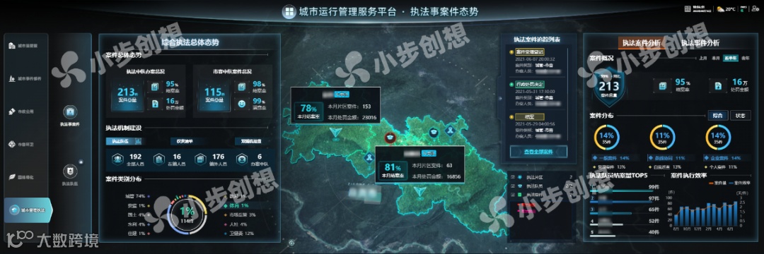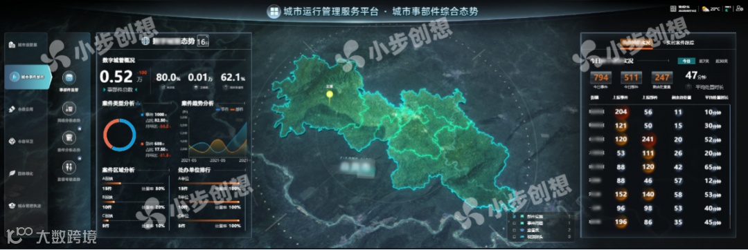 小步创想运用大数据分析和可视化技术,打造城市运行管理服务平台-决策建议系统解决方案,整合人、事、物、组织、地理信息等城市资源要素与数据,实时监测城市管理运行情况,可视化解读城市管理问题,辅助管理者动态掌控城市运行状态,及时响应,为相关政策制定提供决策建议。