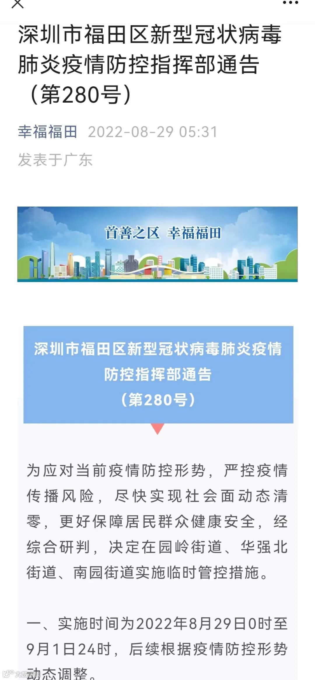 深圳市福田区新型冠状病毒肺炎疫情防控指挥部通告(第280号)