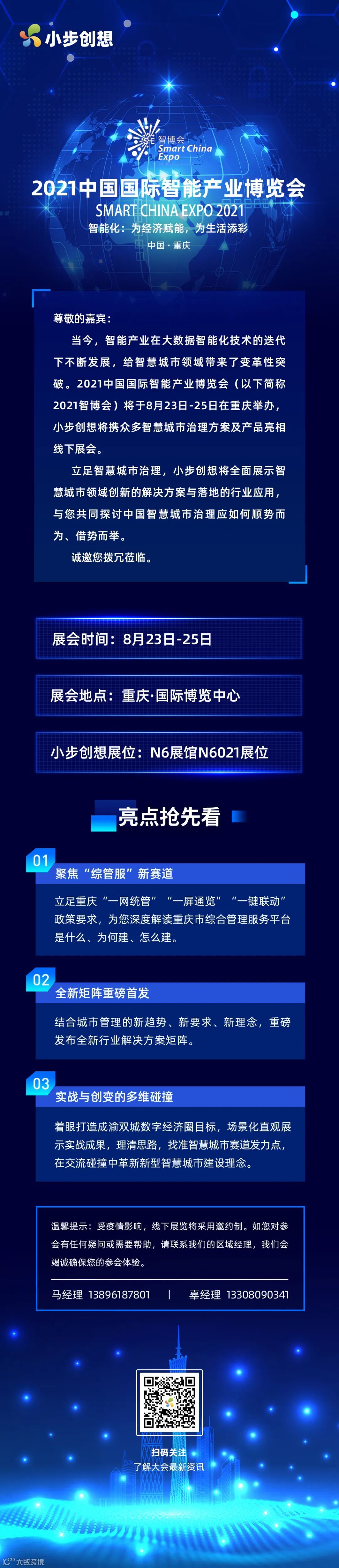 2021中国国际智能产业博览会(以下简称“2021智博会”)将于8月23日-25日在重庆举办。小步创想应邀参会,诚邀您拨冗莅临!
