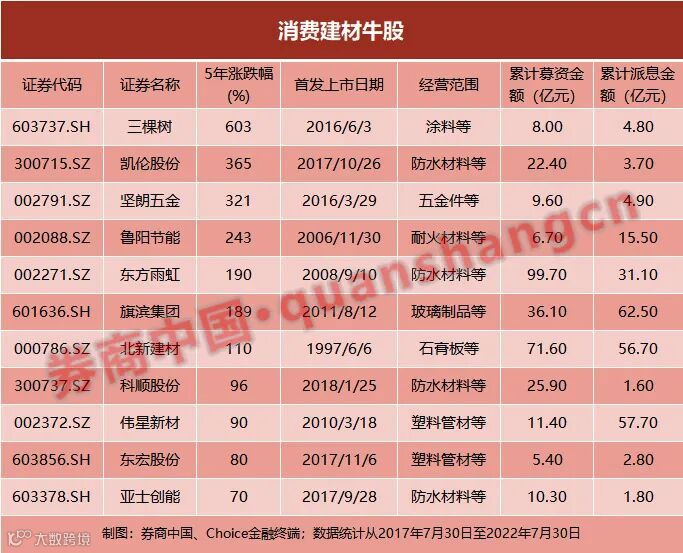 隐匿的“消费基因”也为装修建筑材料公司带来强现金流和高分红,伟星新材、旗滨集团和鲁阳节能等公司表现突出。伟星新材自2010年上市以来募资金额仅为11.4亿元,但累计派息金额却高达57.7亿元。三棵树更是在五年时间,股价暴涨6倍,妥妥的超级大牛股。