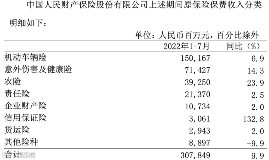 人保财险前7月保费收入3078.49亿元,同比增长9.9%,7月份单月实现保费收入312亿元,同比增长10.4%。