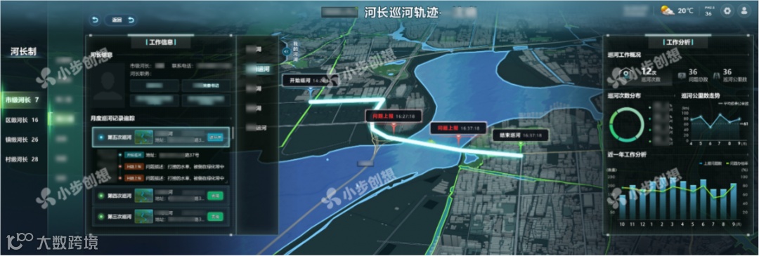 结合3D建模技术,实时监测展示河长巡河轨迹,当河长上报问题时自动定位,同时对河长工作数据进行分析,实现对河长巡河情况的全面掌握,进而提升河湖巡检效率和质量。