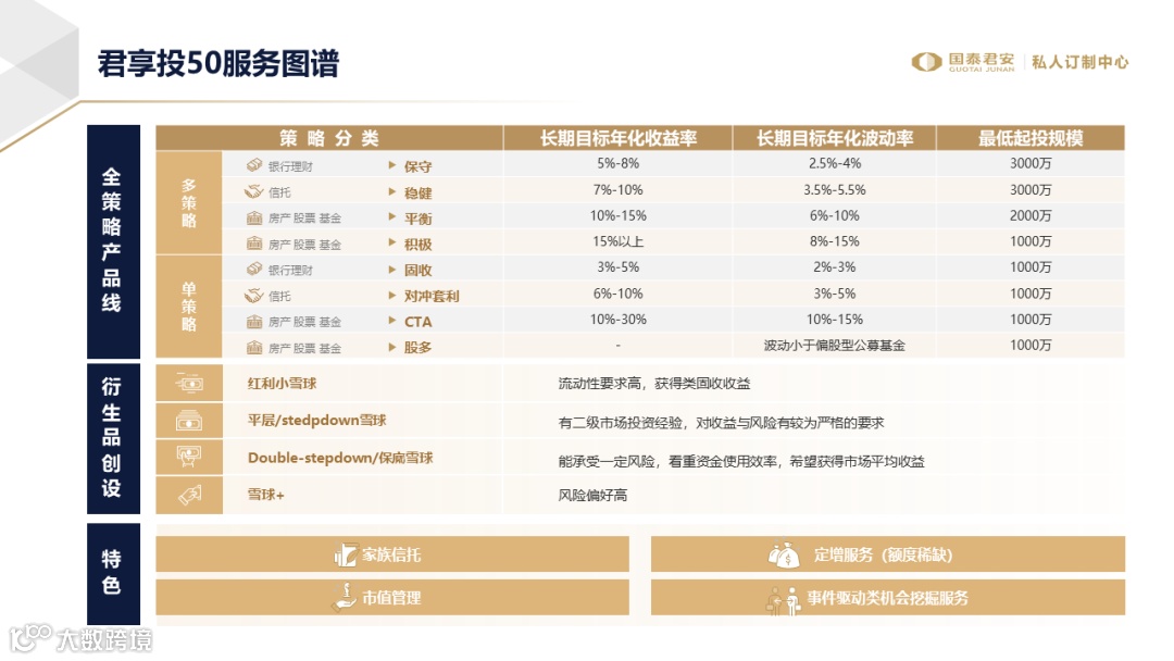在产品线方面,为满足高净值客户多元化投资需求,“君享投50”丰富完善了资产配置解决方案,覆盖全策略产品线,提供衍生品创设和特色配置服务,布局更多适应未来市场需求的产品线。