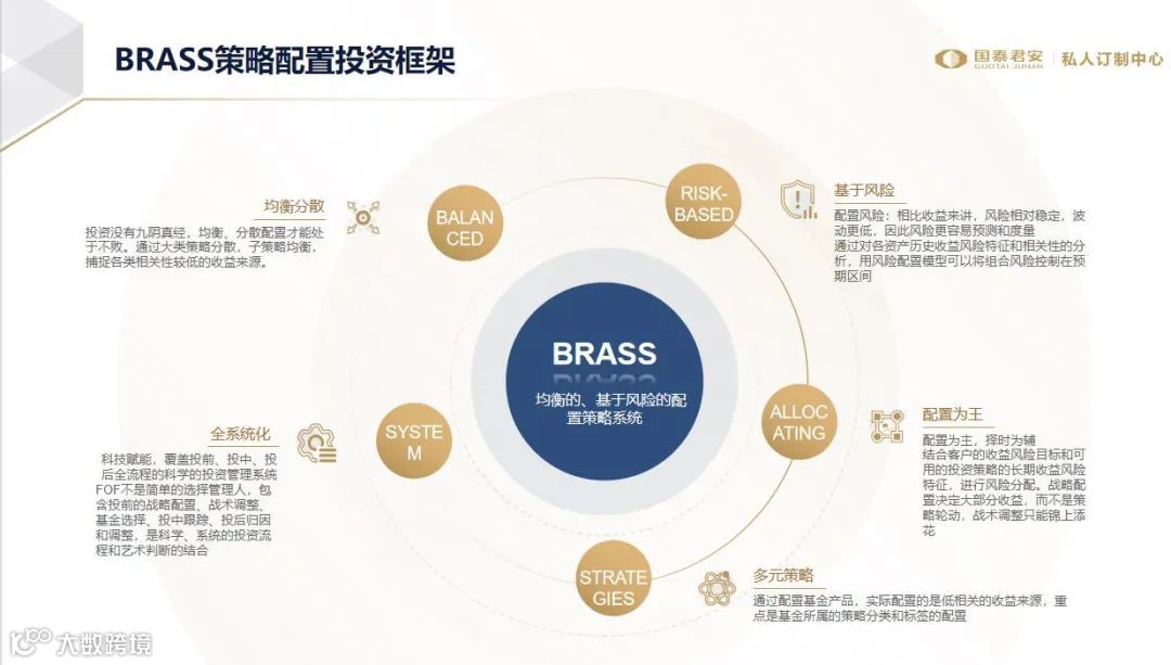 在投研方面,私人订制中心整合集团买方研究资源,形成基于风险,以均衡分散为配置理念,以遵从配置为主,择时为辅为投资理念,多元策略、全系统化的BRASS策略配置体系。