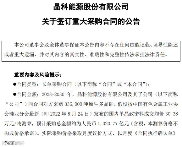 8月26日晚间,晶科能源公告了一份重大采购合同。2023-2030年,晶科能源及其子公司将向新特能源采购33.6万吨原生多晶硅。假设按中国有色金属工业协会硅业分会8月24日发布的国内单晶致密料成交均价30.38万元/吨测算,预计采购总金额约为1020.77亿元(含税)。