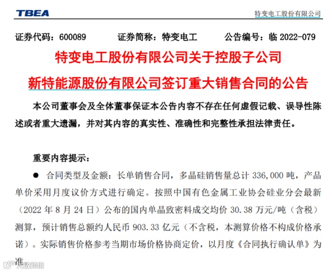 昨日,特变电工控股子公司与晶科能源签署合作买卖协议书,晶科能源公司将于2023年1月1日至2030年12月31日期间向新特能源公司采购原生多晶硅336000吨,总金额预计903.33亿元(不含税)。