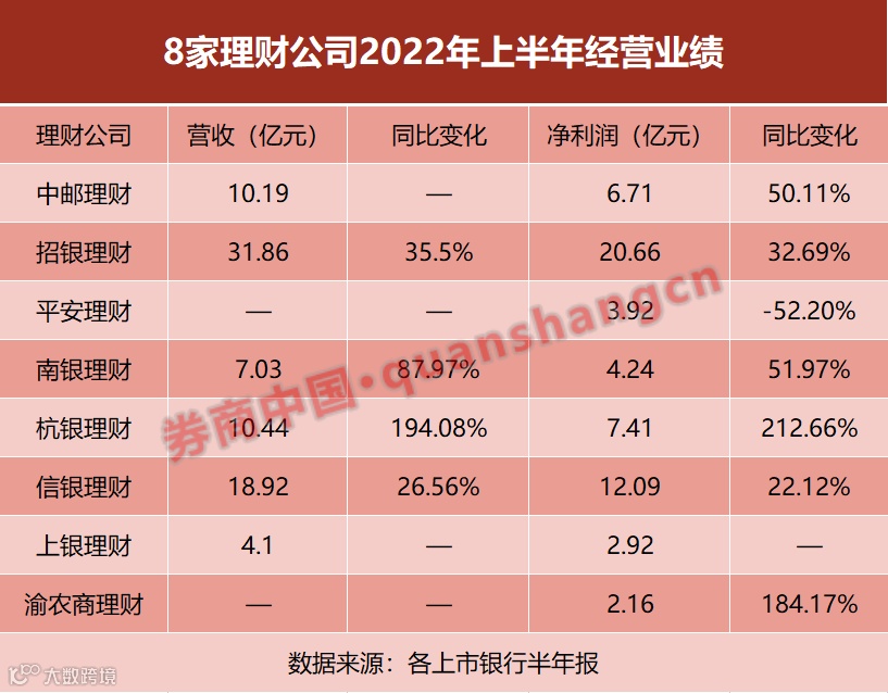 截至8月25日,随着母行发布中报,招银理财、信银理财、中邮理财、平安理财、杭银理财、上银理财和南银理财,以及渝农商理财的上半年“成绩单”均浮出水面。8家公司中有5家净利润增幅超20%,有1家增幅甚至高达212.7%。