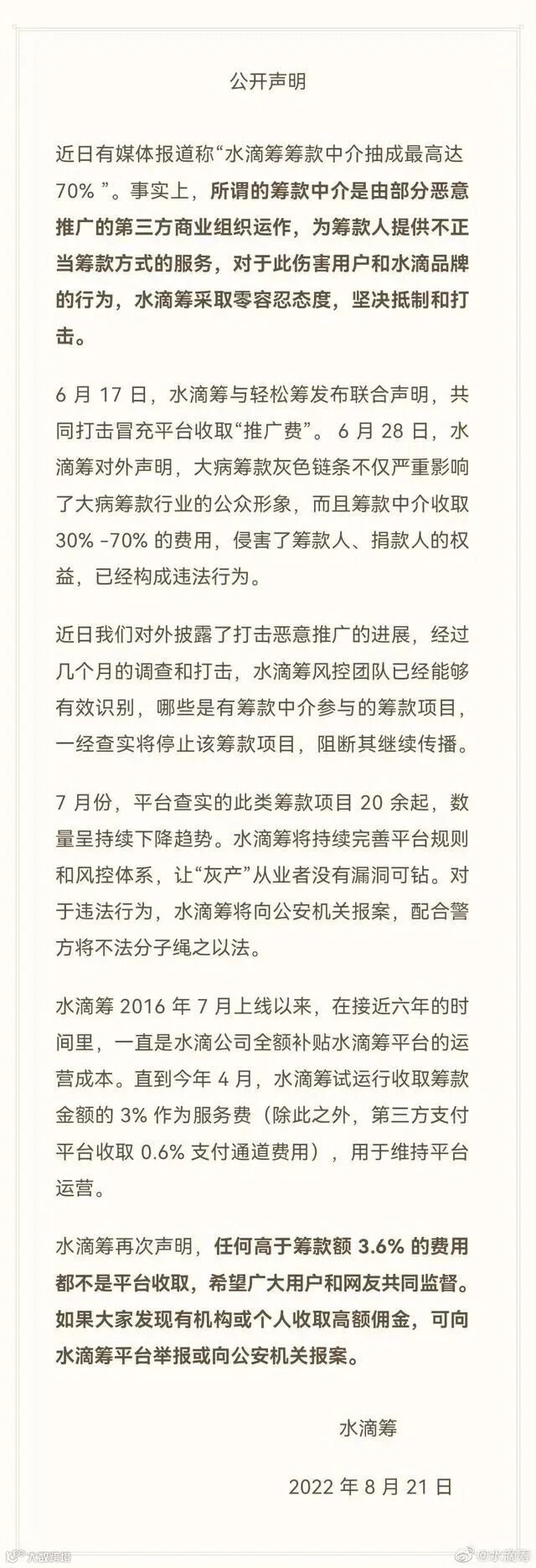 水滴筹发布的声明称,近日有媒体报道称“水滴筹筹款中介抽成最高达70%”,事实上,所谓的筹款中介是由部分恶意推广的第三方商业组织运作,为筹款人提供不正当筹款方式的服务。