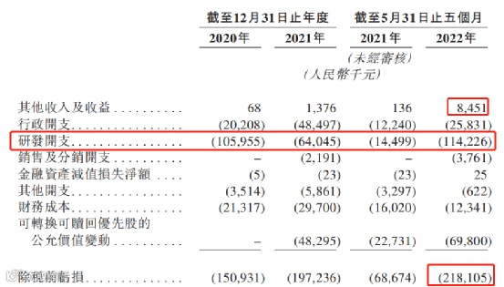 2020年、2021年及2022年前5月,公司“其他收入及收益”为6.8万元、137.6万元、845.1万元,期间亏损分别达到1.51亿元、1.97亿元、2.18亿元。其中研发支出分别为1.06亿、0.64亿和1.14亿元。