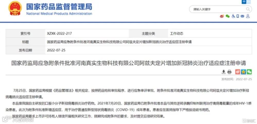 7月25日,国家药监局附条件批准阿兹夫定片增加治疗新冠病毒肺炎适应症注册申请,并要求上市许可持有人继续开展相关研究工作,限期完成附条件的要求,及时提交后续研究结果。