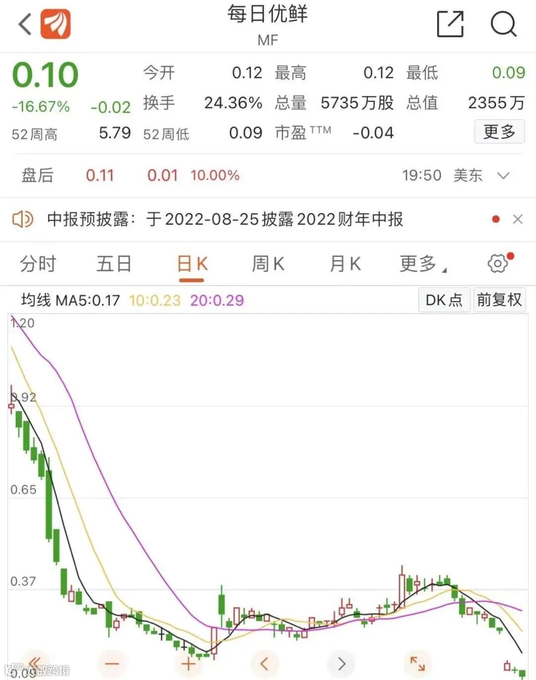 截至8月1日,每日优鲜股价仅为0.10美元,总市值仅剩2355万美元,相比上市时的发行价跌去99%。
