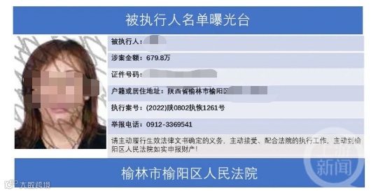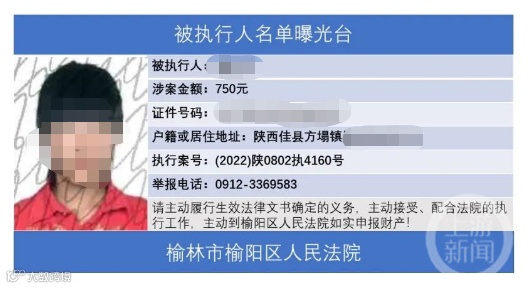 近日,陕西榆林市榆阳区人民法院“榆阳执行”发布的被执行人名单曝光台(第一期)引发关注。其中,一生于97年的女子因涉案金额750元被曝光。